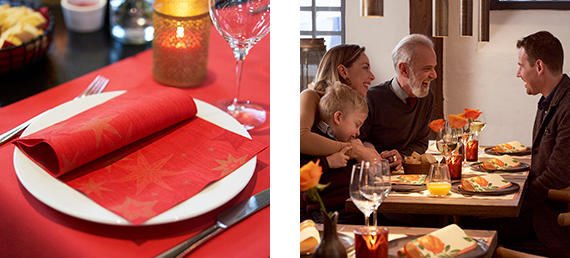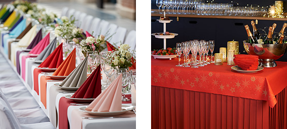 Un événement que vous pouvez singulariser devient tout de suite spécial. Notre collection coordonnée vous permet de concevoir en toute liberté toutes sortes d'ambiances. Elle vous offre une palette riche en tailles, styles et matériaux écologiques pour tous les budgets. Contrairement au textile, elle vous permet de passer des commandes ad hoc et recevoir des produits aux plis, aux couleurs et à l'hygiène impeccables. Un avantage appréciable, surtout en période de fêtes.